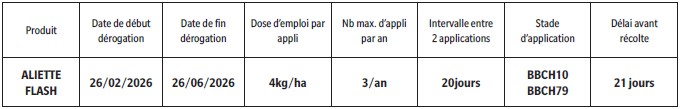 ALIETTE FLASH : dérogation d’usage de 120 jours pour la spécialité ALIETTE FLASH (AMM n°9600025) à base de Fosétyl-aluminium pour la lutte contre champignons pythiacées sur framboisier sous abris et de plein champ. AMM valable du 26/02/2026 au 26/06/2026