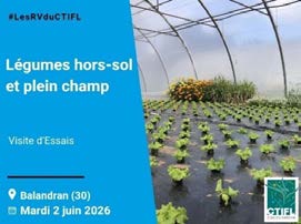 Le CTIFL organise une Visite d’Essais légumes horssol, le mardi 02 Juin 2026, au CTIFL de Balandran (30) ; avec entre autres un atelier “Fraise hors-sol : variétés, adaptabilité au changement climatique et Neopestalotiopsis sp» et un atelier “Protection biologique intégrée”.
