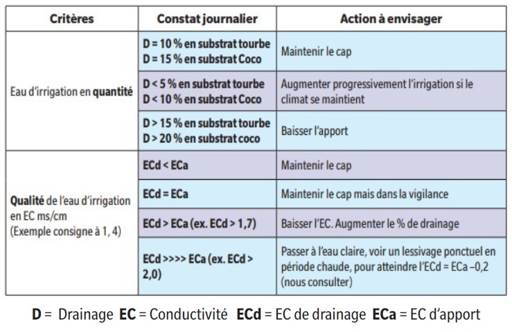 | Calibre | Azote et potassium en quantité adaptée avec gestion de l’EC et de l’eau, acides aminés | Maintien de l’activité physiologique (plant actif) |