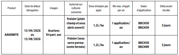 KANEMITE : dérogation d’usage de 120 jours pour la spécialité KANEMITE (AMM n° 2100183) à base de 164 g/L d’acéquinocyl pour la lutte contre acariens sur fraisiers (sous abris et plein champ). AMM valable du 15/04/2026 au 13/08/2026.
